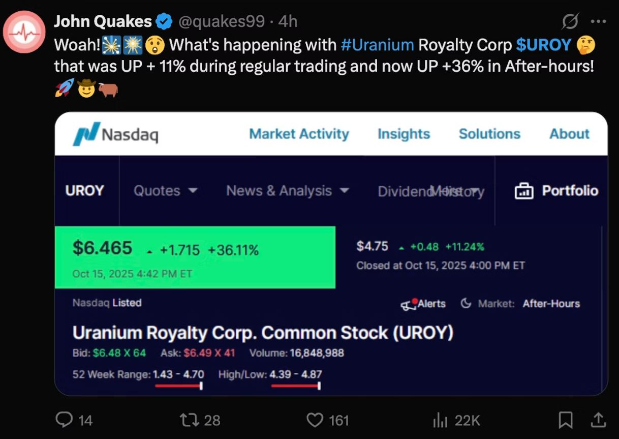 There had been a lot of strange trading behavior in (UROY) during the regular sessions and also in the afterhours trading mid-week. Several other platforms or commentators picked up on this, when it shot up an additional 36% to $6.46 in extended after-hours trading session on Oct 15th. Wild!