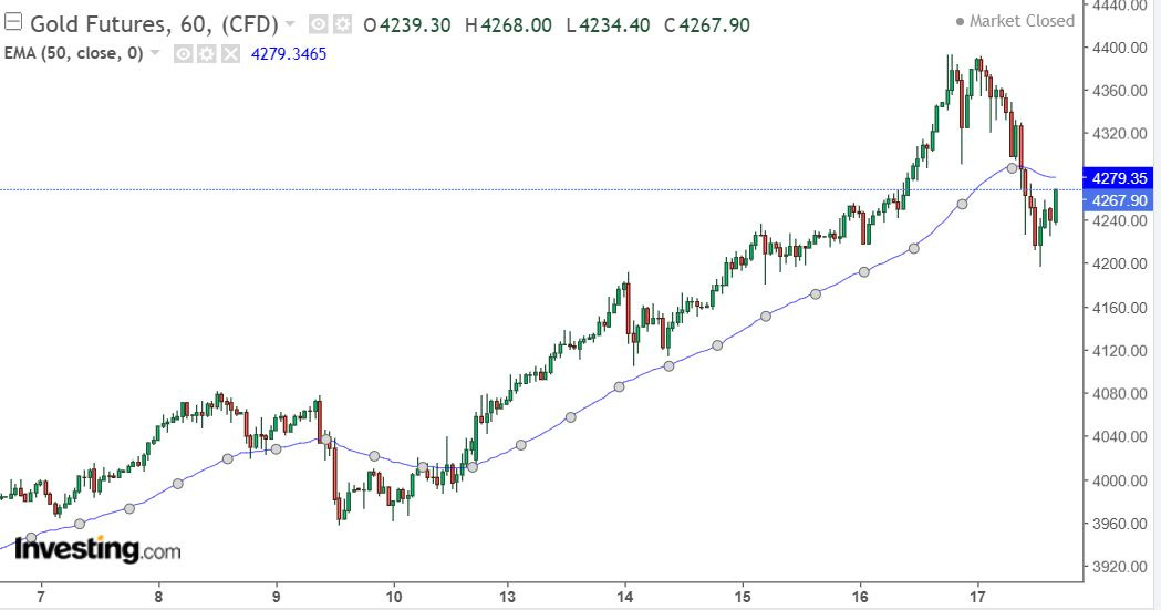 After a blistering run higher where gold was up knocking on the $4,400 door on Oct 16th, (tagging $4,392 in extended market hours), it quickly reversed down on Friday Oct 17th getting briefly below $4,200 (hitting a low at $4,196 and then reversing back higher again).
