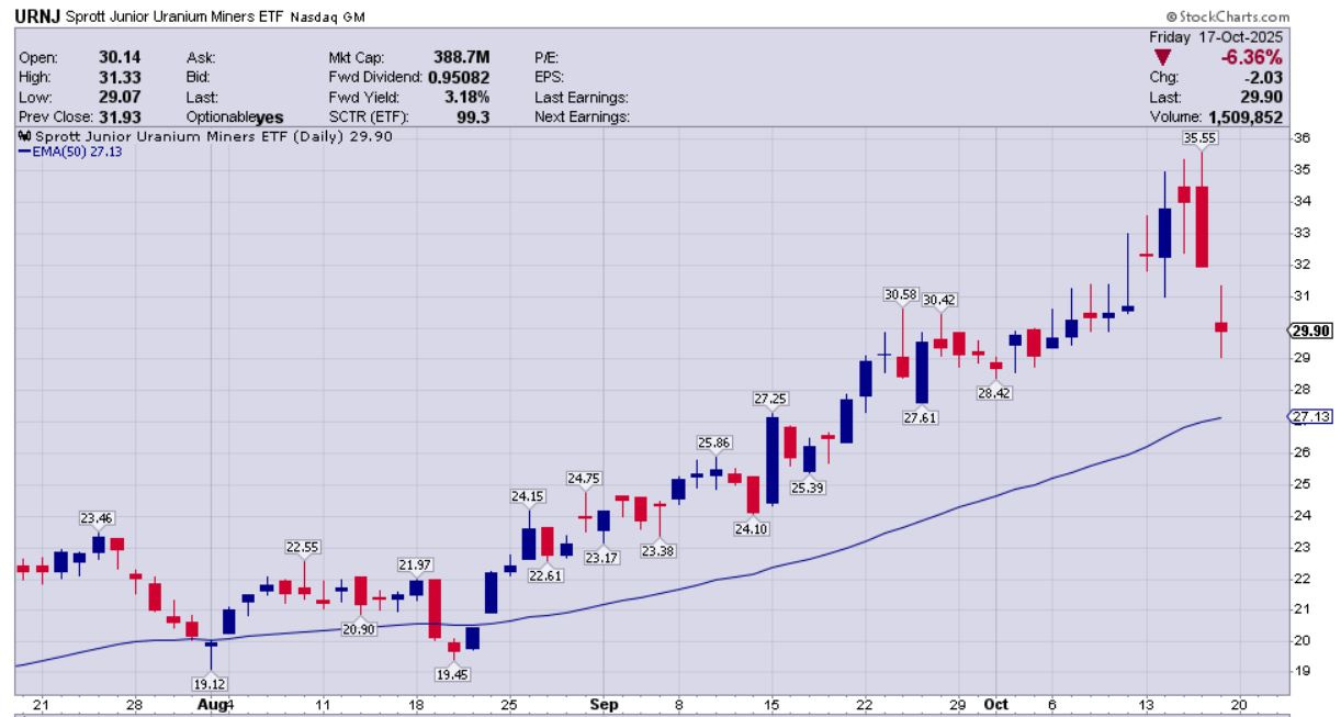Uranium stocks topped out on October 15th & 16th, and reversed down hard on Thursday, and then followed that up with big gap lower on October 17th.