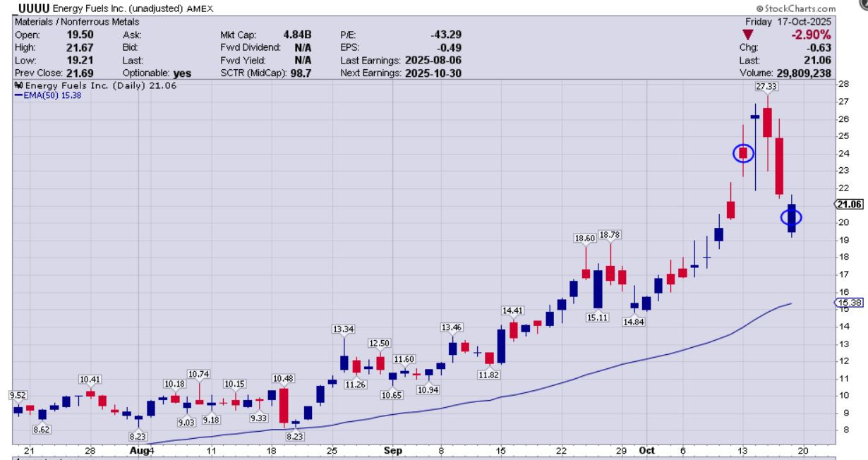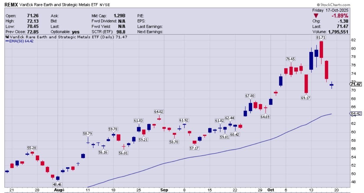 From Friday Oct 10th to Friday Oct 17th, these rare earth stocks inside of (REMX) were all over the place, with wild whipsaw moves and far larger daily price ranges that is typical for this ETF.