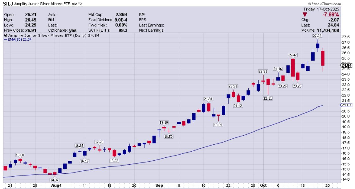The silver mining stocks really took it on the chin on Friday, with the Amplify Junior Silver Miners ETF (SILJ) down 7.69%