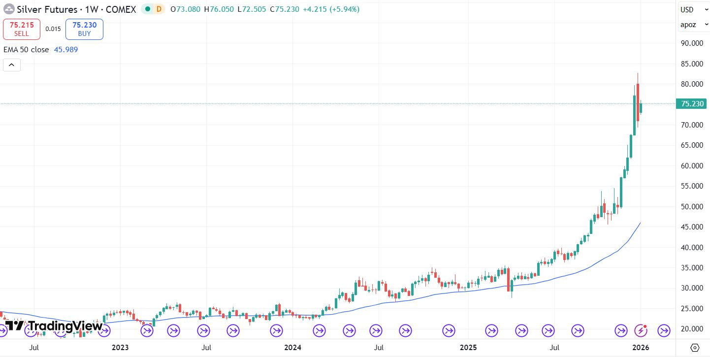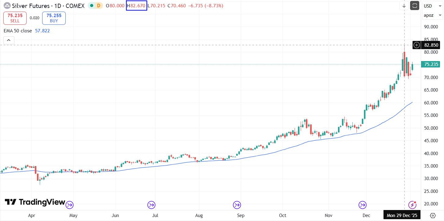 On this daily chart the all-time intraday high is showcased at $82.67, from December 29th, 2025; because it is the new overhead resistance level to see silver clear in the near to medium-term.